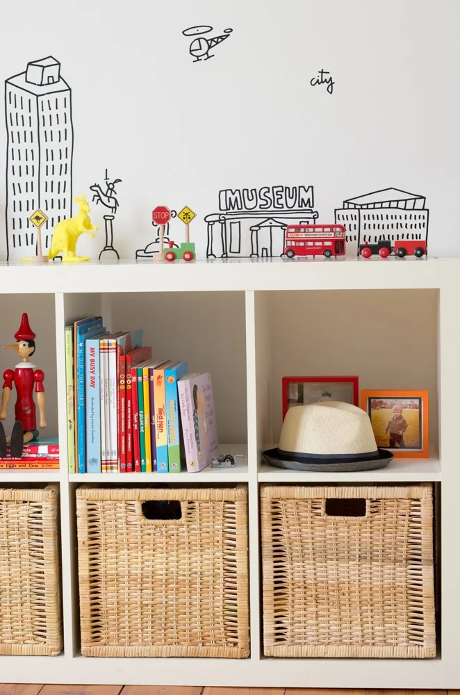 To the wall opposite Max's bed. We decided to keep our two existing IKEA pieces (Expedit bookshelf and Malm chest of drawers). These two pieces work well for us so it seemed frivolous to get rid of them just because we wanted something nicer, that we couldn't really afford anyway. I just had to figure out how to make these existing pieces work for Max in his new room. I originally saw the cityscape wall decals positioned above the same IKEA Expedit bookshelf. The decals are from Chispum, a Spanish company. I replicated this look to give Max a play area at his own height teamed with train tape from Little Me Little You to complete a virtual city with train tracks, cars and transport vehicles. Some of Max's favourite things and keeping in the 'places' theme.