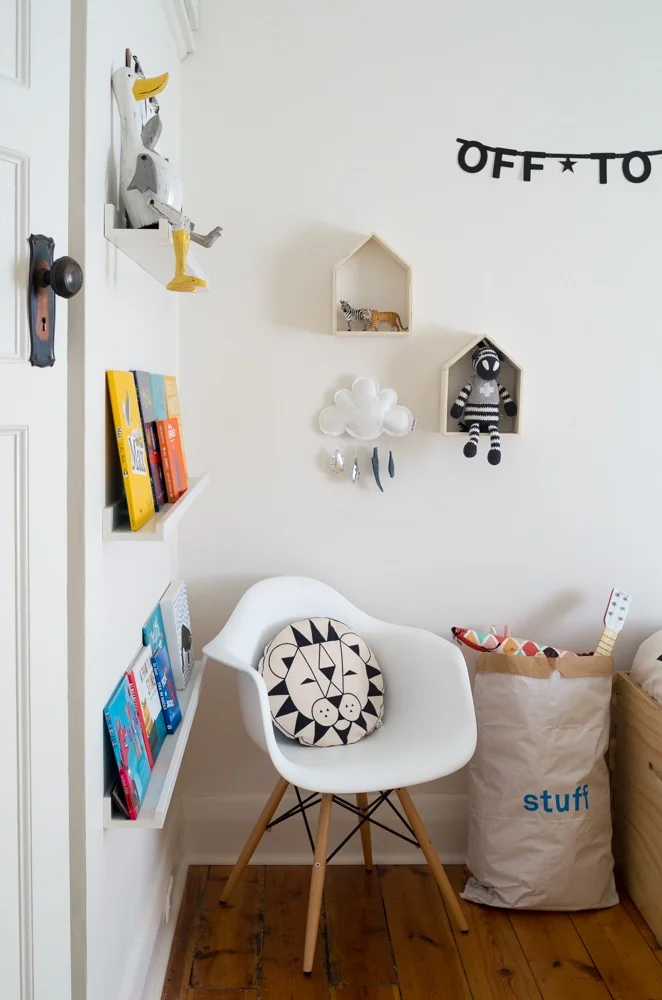 Finishing this wall off are shadow boxes from Cotton On Kids which make great little vignettes for Max's Schleich animals and the La De Dah Kids Zaney Zebra. The Sir Trouble Handmade storm cloud is cloud porn personified! I turned the little space at the end of Max's bed into a reading corner which will grow with him through the years. It's a bit of a tricky space because there are three small cupboards high up above the wall which can't be accessed without a step ladder. Very awkward but from time to time I need to access storage in these cupboards. So a reading corner with no obstructions was the best use of space here. IKEA ribba picture ledges, and replica Eames chair from Globe West and THAT lion cushion by Anny Who, a gorgeously quirky and fun label from Germany, from This Modern Life.