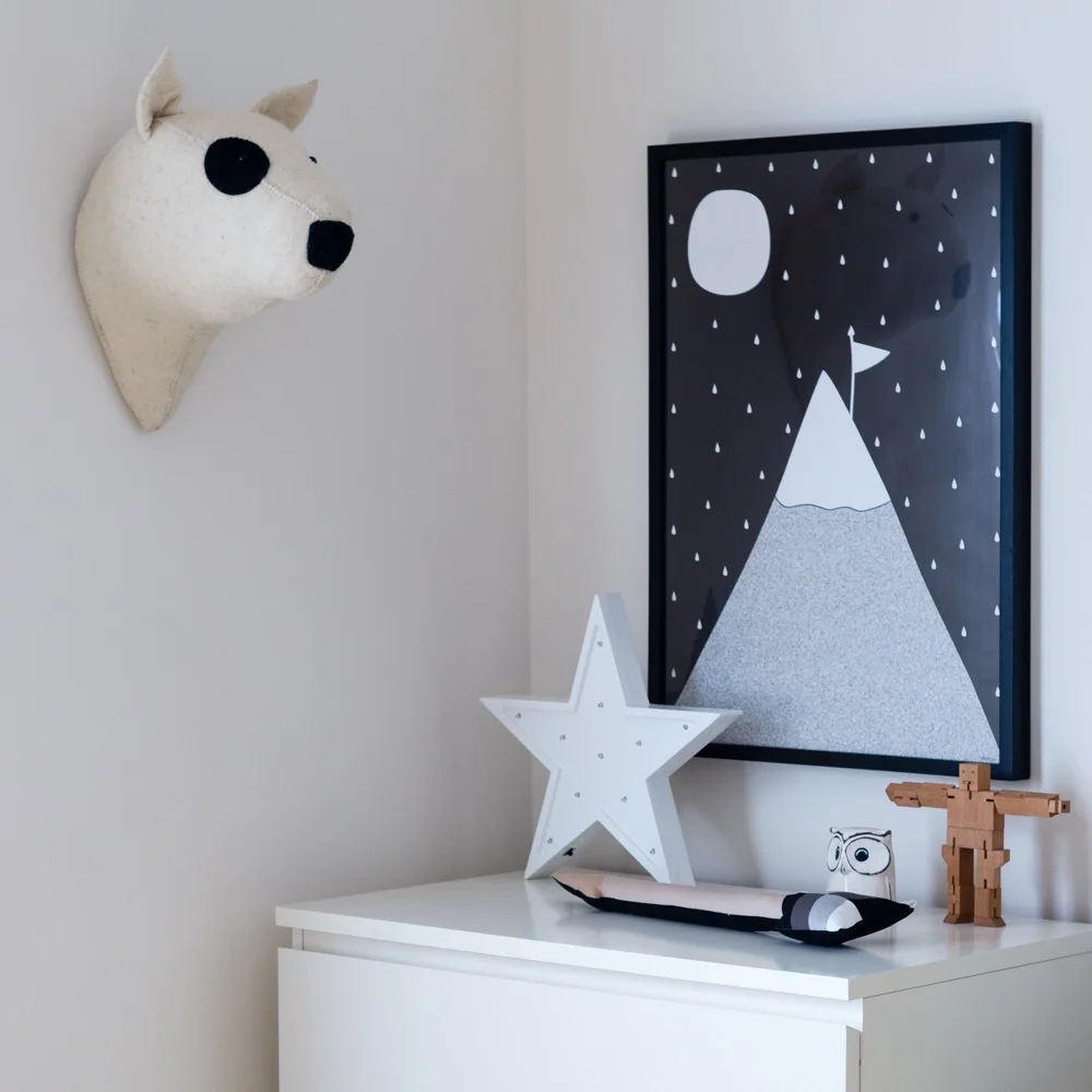 Above the IKEA Malm chest of drawers is Mini Willa's Berg print from Leo and Bella. Mini Willa is a gorgeous Swedish brand that is fun, unique and on-trend. Every cityscape needs a mountain, right? A white star light from Little Letter Lights Co. which I had coveted for a while and was lucky to get my hands on, are produced by a local Australian company. We use our star light as a night light as I have one little boy that is scared of the dark. I like to keep the chest of drawers uncluttered (easy to do with lots of storage options in this room) and home to a couple of lovely items like the monochrome arrow from Made by Mosey.