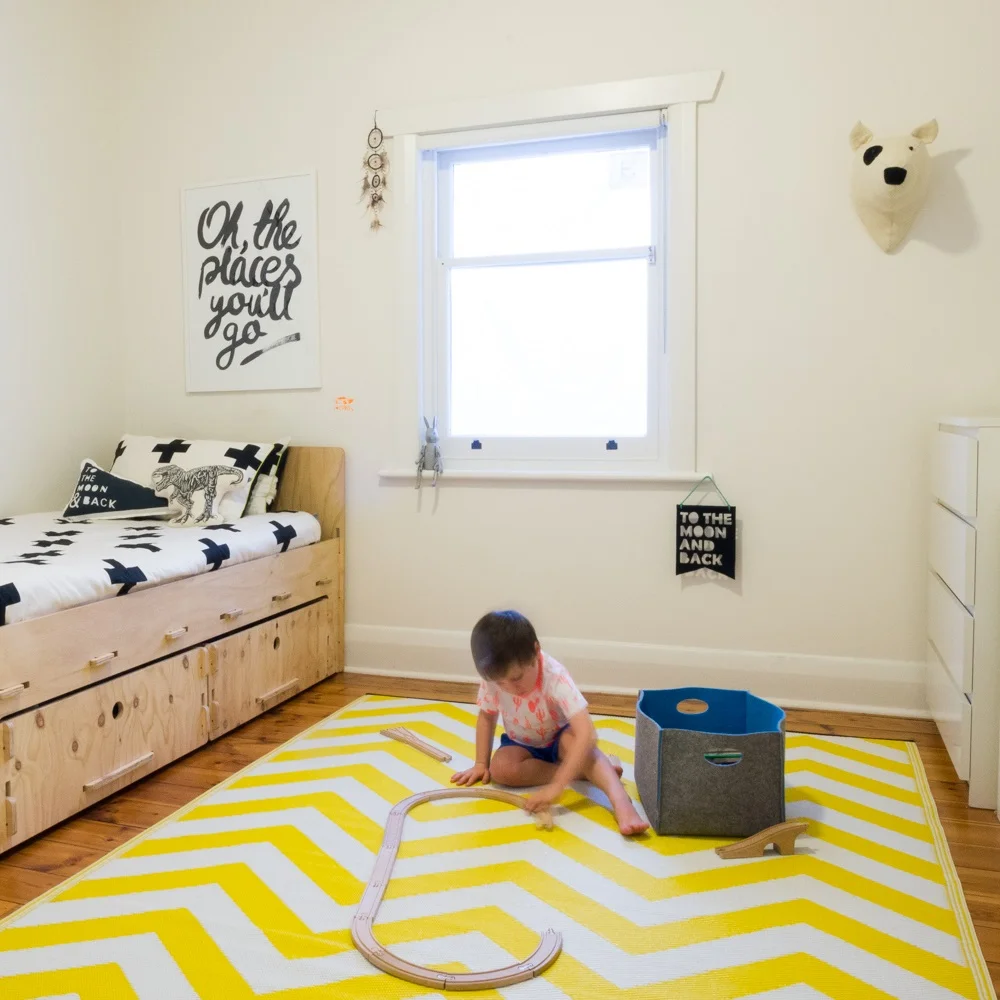 The second hero piece was the yellow Fab Habitat chevron rug. I adore the colour yellow and chevron so I fell in love with this rug. Max's room is pretty big so I went with the largest sized rug. The indoor/outdoor rug is so versatile, it's made of eco-friendly recycled polypropylene, but it doesn't look like plastic, and it can take the hammering and battering of a 3 year old boy. Dirt, sand, dust are all just vacuumed away.
