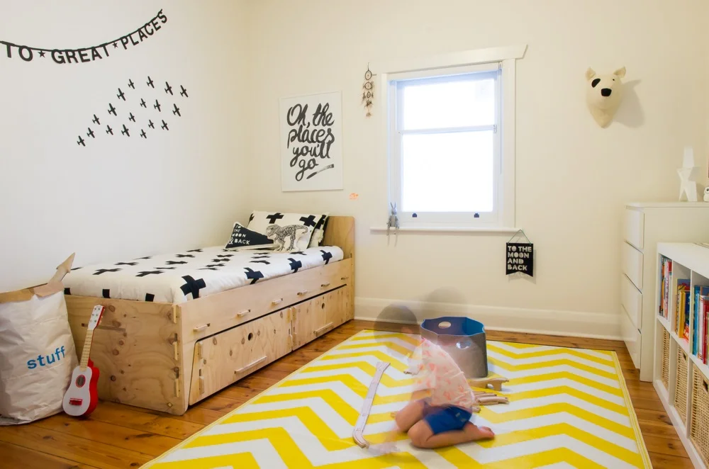 Max's room then took on a monochrome vibe which I've coined Monochrome Pop! I'm a big fan of colour but the room needed monochrome tones to offset the colour pop of the yellow rug. I wanted the rug to be a stand out. So black and white was the perfect choice.